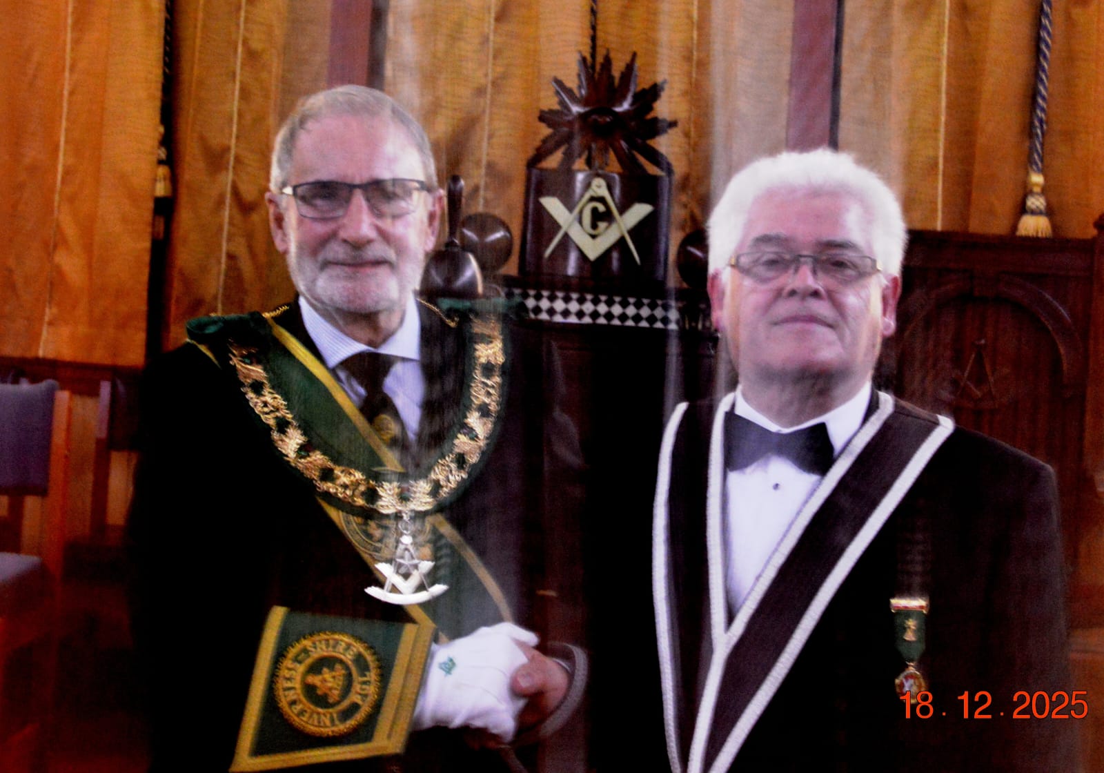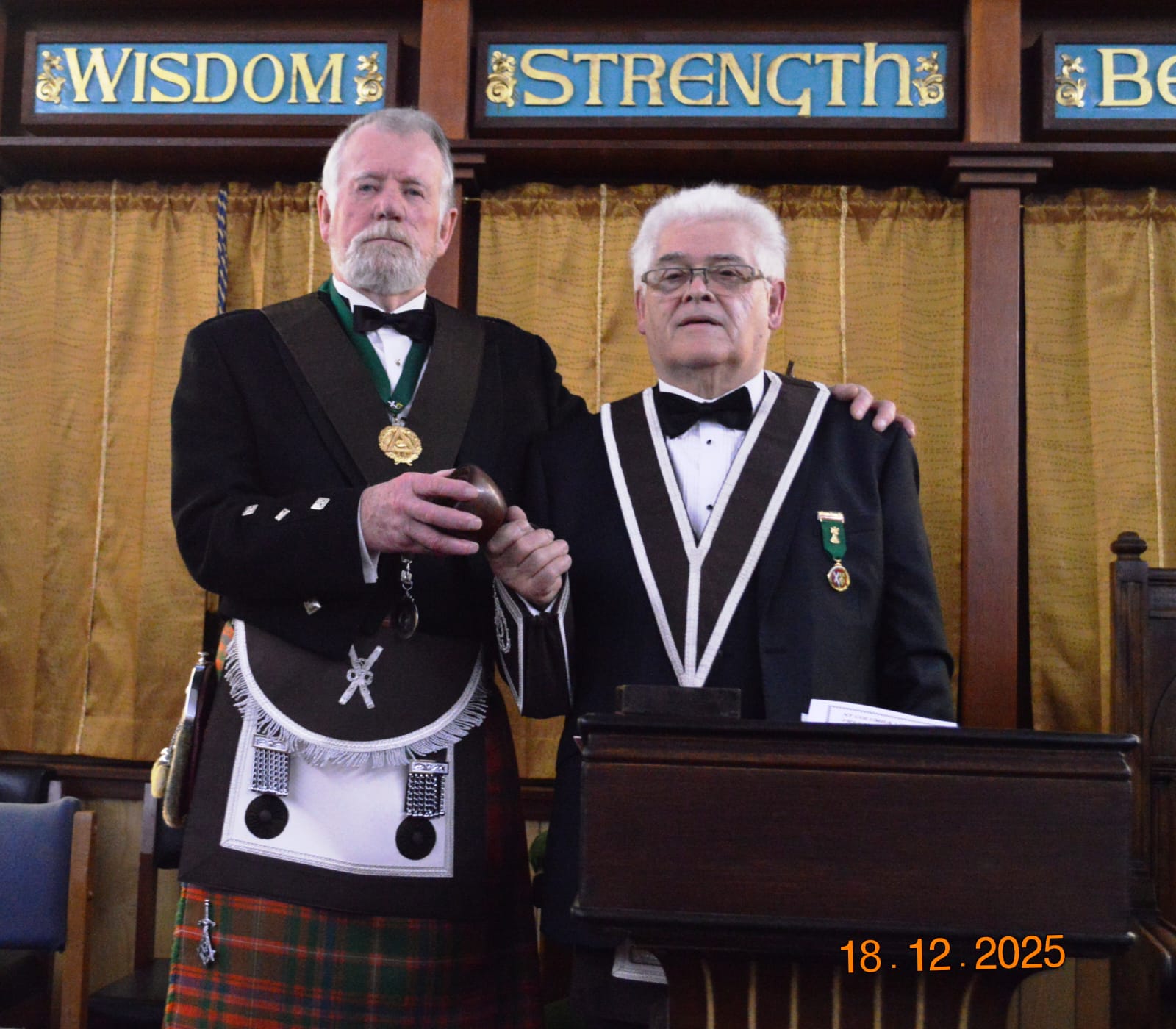 Lodge Centenary Stone Barry Fraser Presenting cheque to Mhairi Fraser for Hospice/Strictly fund raising